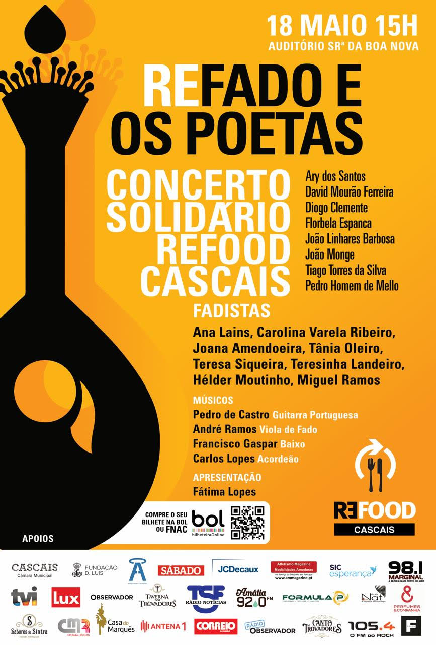 Com apresentação de Fátima Lopes, realiza-se este domingo (15h00) um Concerto Solidário REFADO e OS POETAS no Auditório Sr.ª da Boa Nova em S. João do Estoril. O evento homenageia grandes poetas como é o caso de Ary dos Santos, David Mourão Ferreira, Diogo Clemente, Florbela Espanca, João Linhares Barbosa, João Monge, Pedro Homem de Mello e Tiago Torres da Silva. Será um espectáculo que une artistas através da música, que querem ajudar a Refood-Cascais.