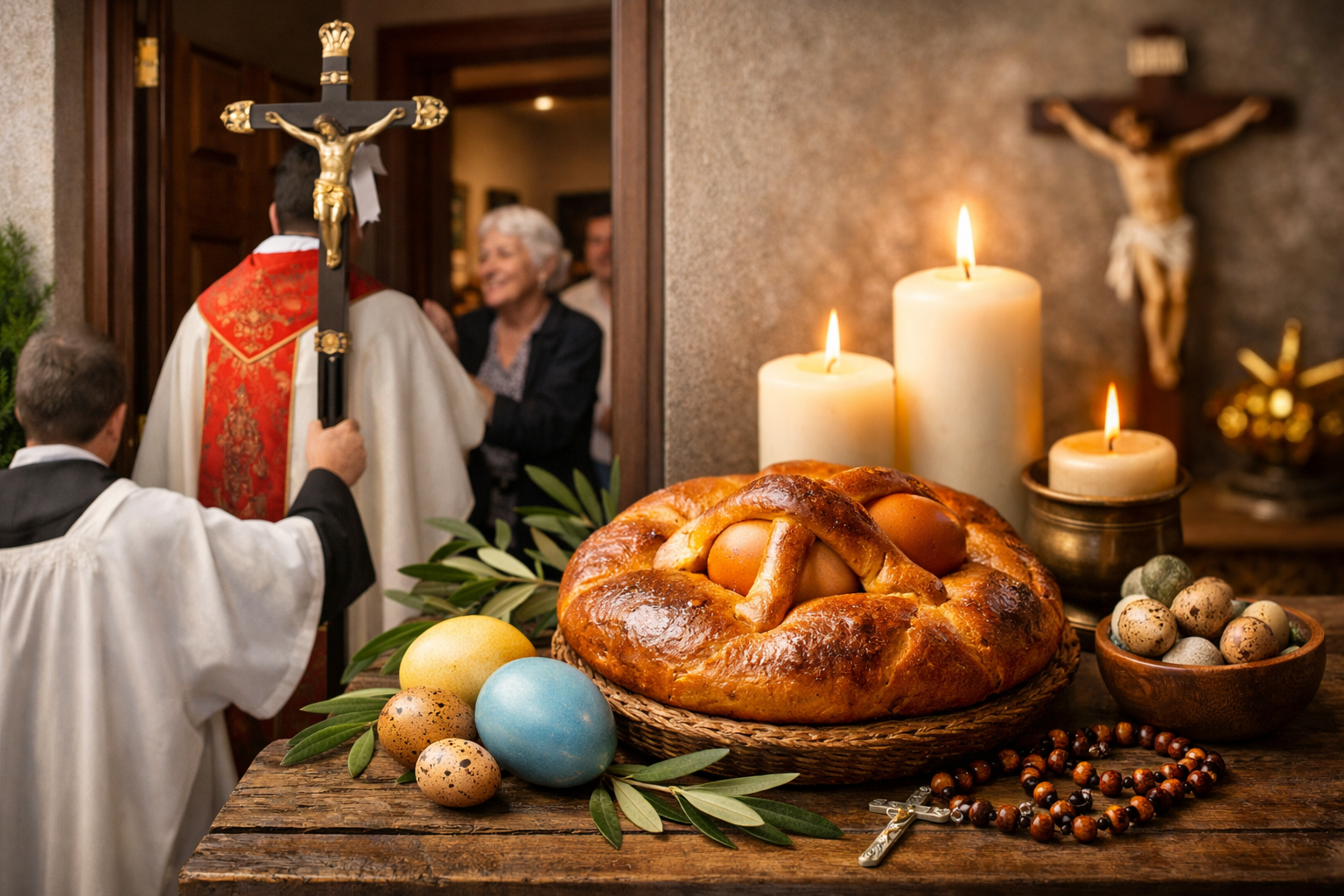 Durante a visita, a casa e os seus habitantes são abençoados, sendo habitual que os presentes beijem o crucifixo. Para assinalar a ocasião, as famílias preparam o espaço e organizam a mesa, criando um ambiente de convívio e partilha.