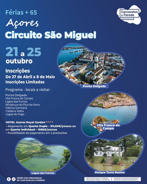 A União de Freguesias de Carcavelos e Parede está a promover um mega-passeio (para maiores de 65 anos de idade) aos Açores no final do mês de Outubro.